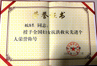 “全國(guó)婦女抗洪救災(zāi)先進(jìn)個(gè)人”榮譽(yù)稱(chēng)號(hào)
