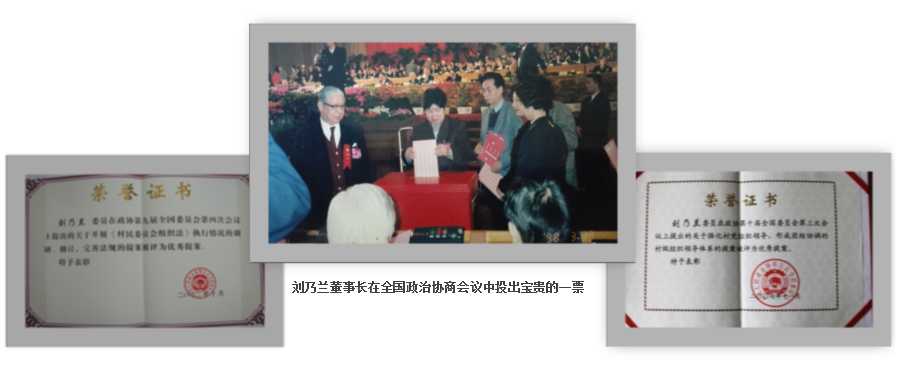 劉乃蘭董事長連續(xù)三屆當(dāng)選全國政協(xié)委員(1998—2013年),為了加強(qiáng)參政議政能力,她經(jīng)常走進(jìn)基層,了解難點、重點問題,深入調(diào)研、走訪、論證,以嚴(yán)謹(jǐn)負(fù)責(zé)的態(tài)度提出大量有價值、有分量、與時俱進(jìn)、順應(yīng)民生的優(yōu)秀提案。 15年來共向全國政協(xié)會議提交提案和大會發(fā)言近百份,其中《關(guān)于開展村民委員會組織法執(zhí)行情況的調(diào)研、修訂、完善法規(guī)》和《關(guān)于強(qiáng)化村黨組織領(lǐng)導(dǎo),形成團(tuán)結(jié)協(xié)調(diào)的村級組織體系》兩份提案獲得“全國優(yōu)秀提案獎” ,受到黨和國家的高度重視,體現(xiàn)了一名共產(chǎn)黨員與優(yōu)秀企業(yè)家的政治素養(yǎng)與普世情懷。